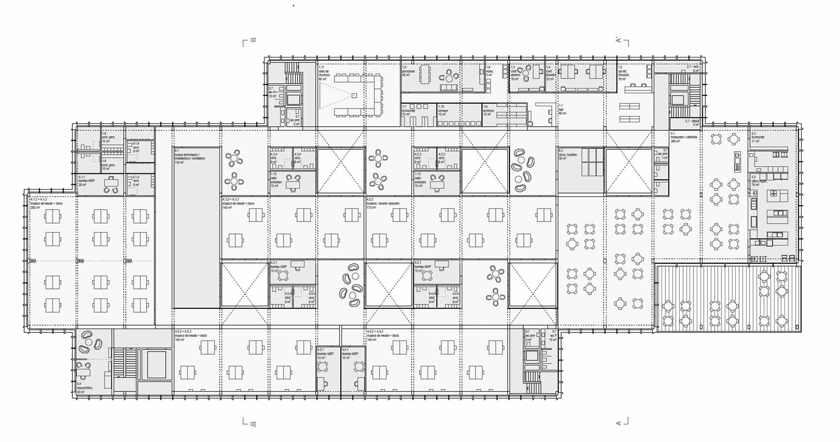 Les travées constructives offrent une grande souplesse d’aménagement et de disposition des éléments du programme. Les accès et les cages d’escalier sont disposés dans les angles du bâtiment, libérant tout le centre dans le but d’offrir une flexibilité maximale pour l’aménagement des différents locaux du programme. La disposition en couches successives coulissant les unes par rapport aux autres favorise la marche en avant du processus productif et un cloisonnement évolutif des différents espaces de travail.