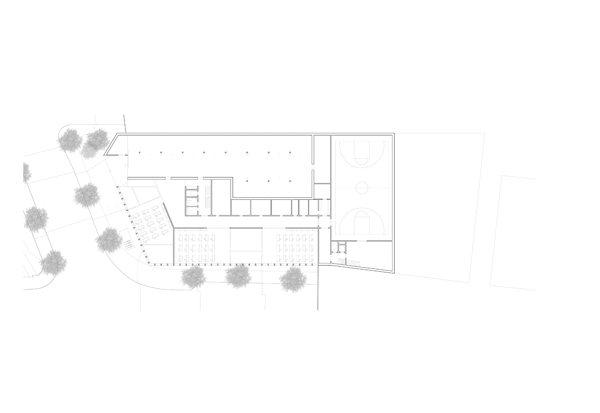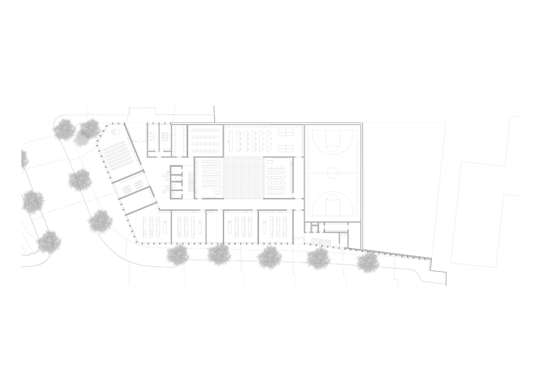 Le bâtiment est relié à son environnement par des accès distincts qui suivent la déclivité des trois rues qui le bordent. Ces accès séparés et indépendants répondent à la demande du Maître d’ouvrage de distinguer et répartir le flux des élèves selon les programmes ou l’utilisation des locaux en dehors des horaires scolaires. L’accès principal de l’école se trouve au niveau de l’esplanade et fait « pendant » à l’entrée du collège des Croix-Rouges. La typologie et l’organisation de l’école est relativement simple : elle tire parti du site et des rues en pente qui la bordent, ainsi que des dégagements sur le paysage urbain et lacustre. Les salles de classes spéciales installées dans le socle s’organisent en « couronne » sur le pourtour du bâtiment autour d’un noyau de circulation verticale et d’un patio. Les salles de classe situées dans la tête émergente s’organisent simplement de part et d’autre d’un couloir central. Les circulations sont réduites à l’essentiel et ponctuées de lumière naturelle pour minimiser l’utilisation de l’éclairage artificiel. Elles sont également pourvues de dégagements sur l’extérieur pour faciliter l’orientation dans le bâtiment et offrir des vues sur le paysage. Cette organisation modulaire permet des rocades entre les différents locaux si le MO le souhaite, sans que le concept de base n'en soit modifié.