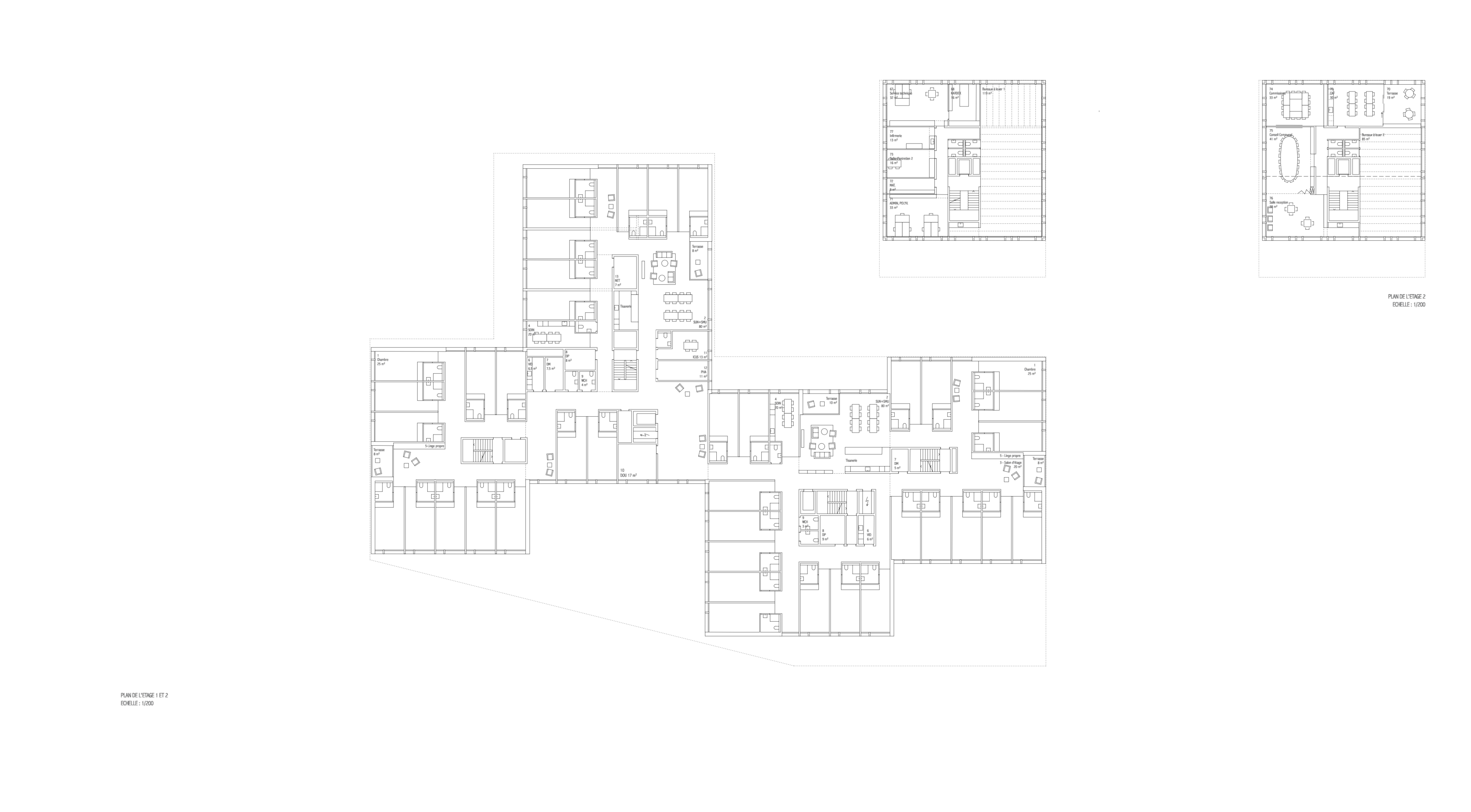 Le EMS est conçu comme un hameau regroupant des « maisonnées », qui, par un jeu de coulisses, crée des espaces extérieurs aux caractères bien différenciés. L’entrée principale de l’EMS est accessible à l’extrêmité sud de la nouvelle place du village arborisée. Le rez-de-chaussée accueille toutes les fonctions publiques et semi-publiques.La mixité de toutes les fonctions, réunies entre elles au rez-de-chaussée, en relation directe avec la place et les jardins, crée cet esprit de place de village où les échanges-rencontres sont riches et nombreux. Les unités de vie sont réparties sur deux niveaux, 2x 20 chambres par niveau. Les circulations horizontales se veulent fluides et bénéficient de tous côtés de vues sur l’extérieur et de lumière naturelle. En leur extrêmité, de petits séjours accompagnés de balcons, agrémentés de quelques fauteuils permettent une halte ouverte sur le jardin. Le bâtiment communal est au niveau urbain un bâtiment d’articulation entre les deux sous-espaces de la place publique de la gare et l’espace public plus protégé au sud où se trouvent les entrées au bâtiment communal, au parking souterrain, à l’EMS et à la salle communale. Le bâtiment est organisé sur trois niveaux : le rez-de-chaussée avec les bureaux de l’administration publique et un commerce à louer (ex : boulangerie, tea-room, autre), le premier étage avec le solde des bureaux de l’administration et des surfaces à louer, et le deuxième étage, dans un espace de combles accueillant les salles représentatives de la commune. La structure porteuse prévue, tout en étant en bois, rend possible les adaptations, les rocades selon l’évolution des besoins.